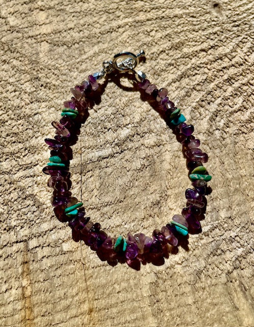 Whether worn alone as a statement piece or paired with matching accessories for a coordinated look, our Amethyst and Turquoise Chip Bracelet is sure to become a cherished addition to your jewelry collection, exuding charm, and sophistication with every wear.