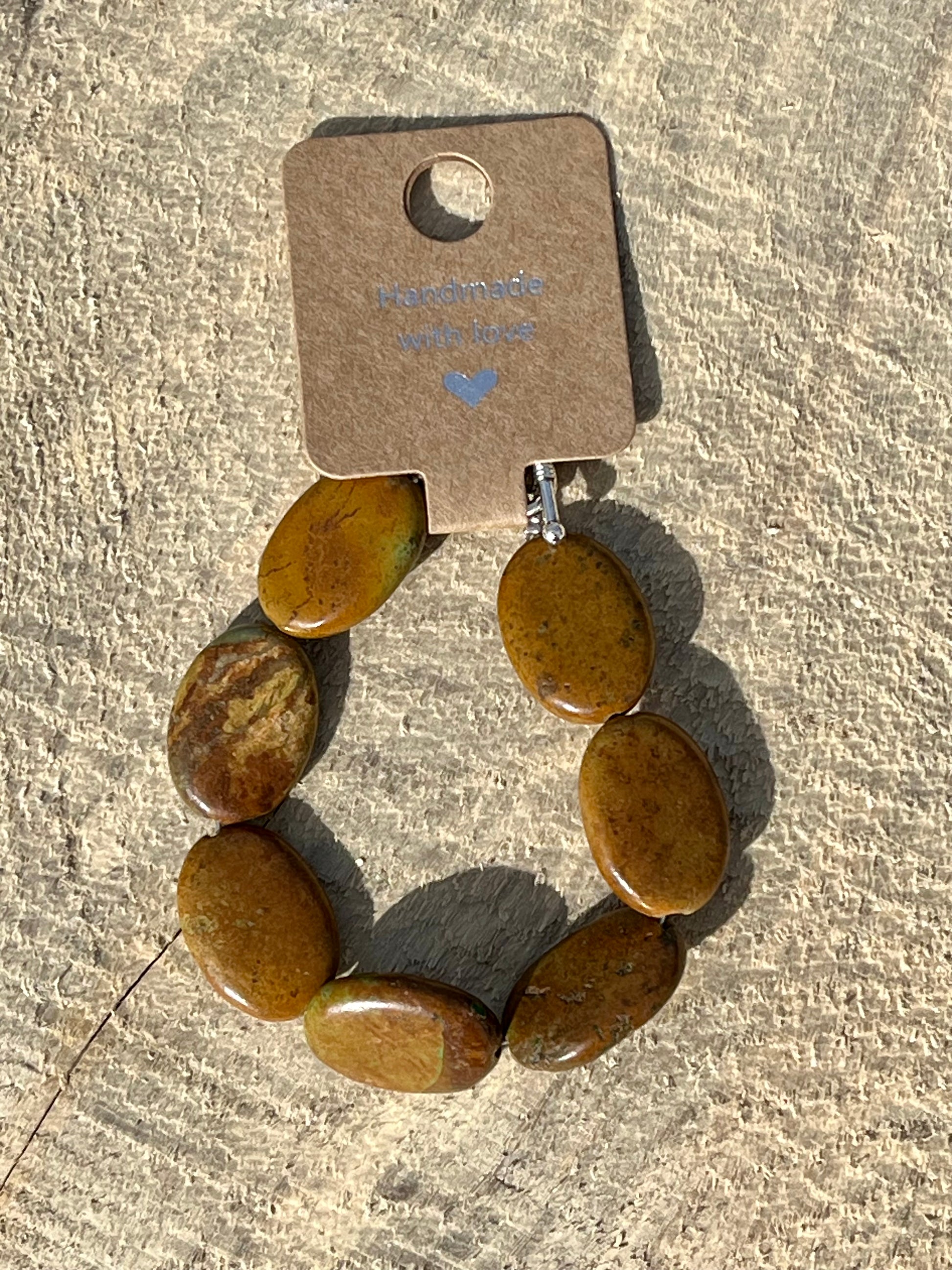 Wrap your wrist in the understated beauty of brown turquoise with this enchanting bracelet. The oval-shaped stones exhibit a breathtaking array of light brown tones, complemented by subtle hints of blues and greens, creating a mesmerizing tapestry of colors. Despite brown turquoise not being as prominently sought after as its vivid blue counterparts, this bracelet showcases the stone's exquisite appeal and unique character. Each bead tells a story through its intricate shades, offering a refined and elegant look that is both distinctive and timeless. Elevate your style with this bracelet, celebrating the distinctive charm of brown turquoise and embracing the beauty of its nuanced and earthy color palette.