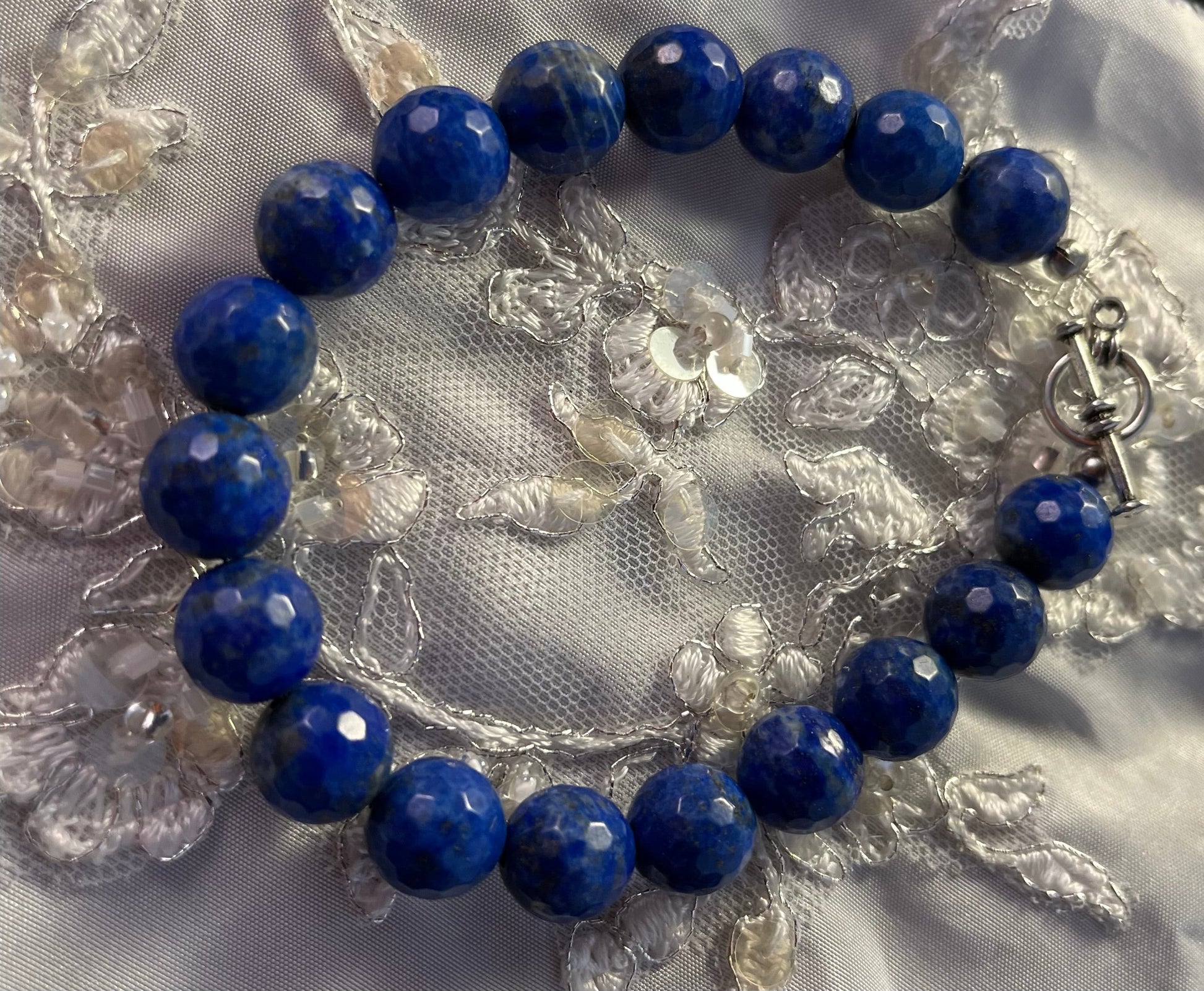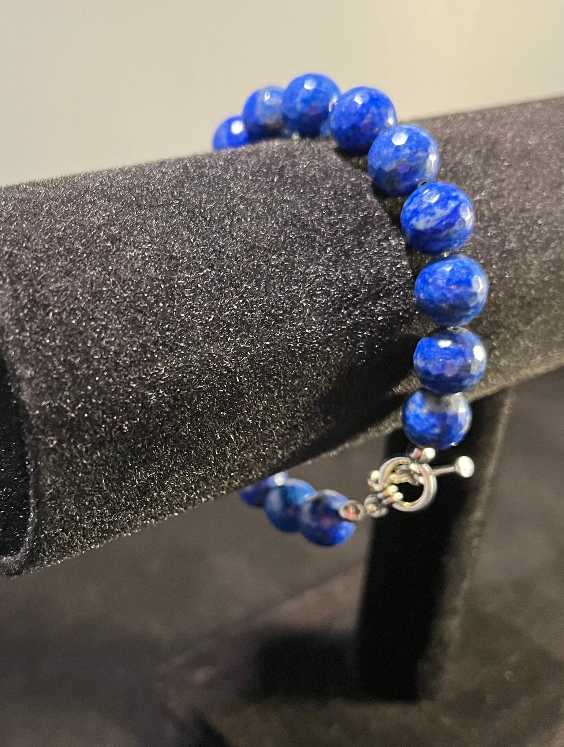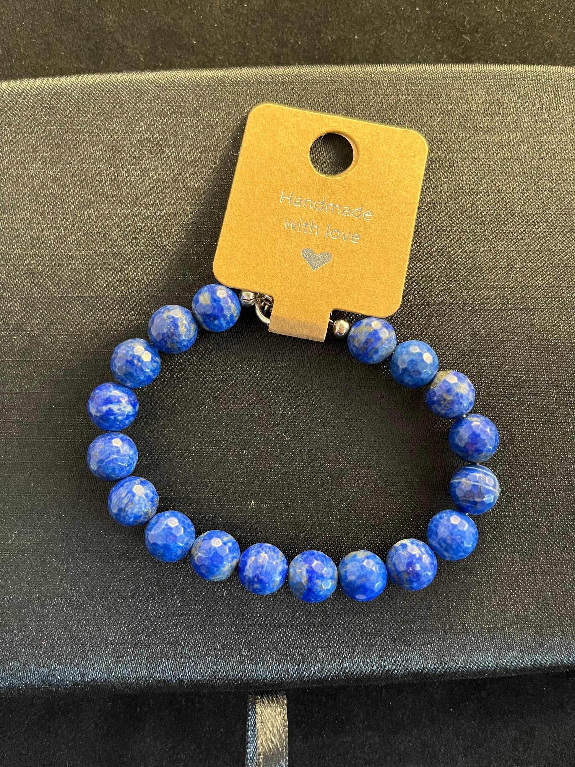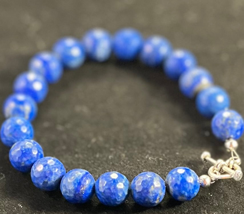This exquisite bracelet features meticulously faceted lapis lazuli beads, each cut to perfection to enhance the natural richness and depth of the stone. The facets catch and reflect light, creating an entrancing play of hues that mirror the starry night sky. The deep blue tones are reminiscent of ancient royalty, adding a regal touch to any ensemble.