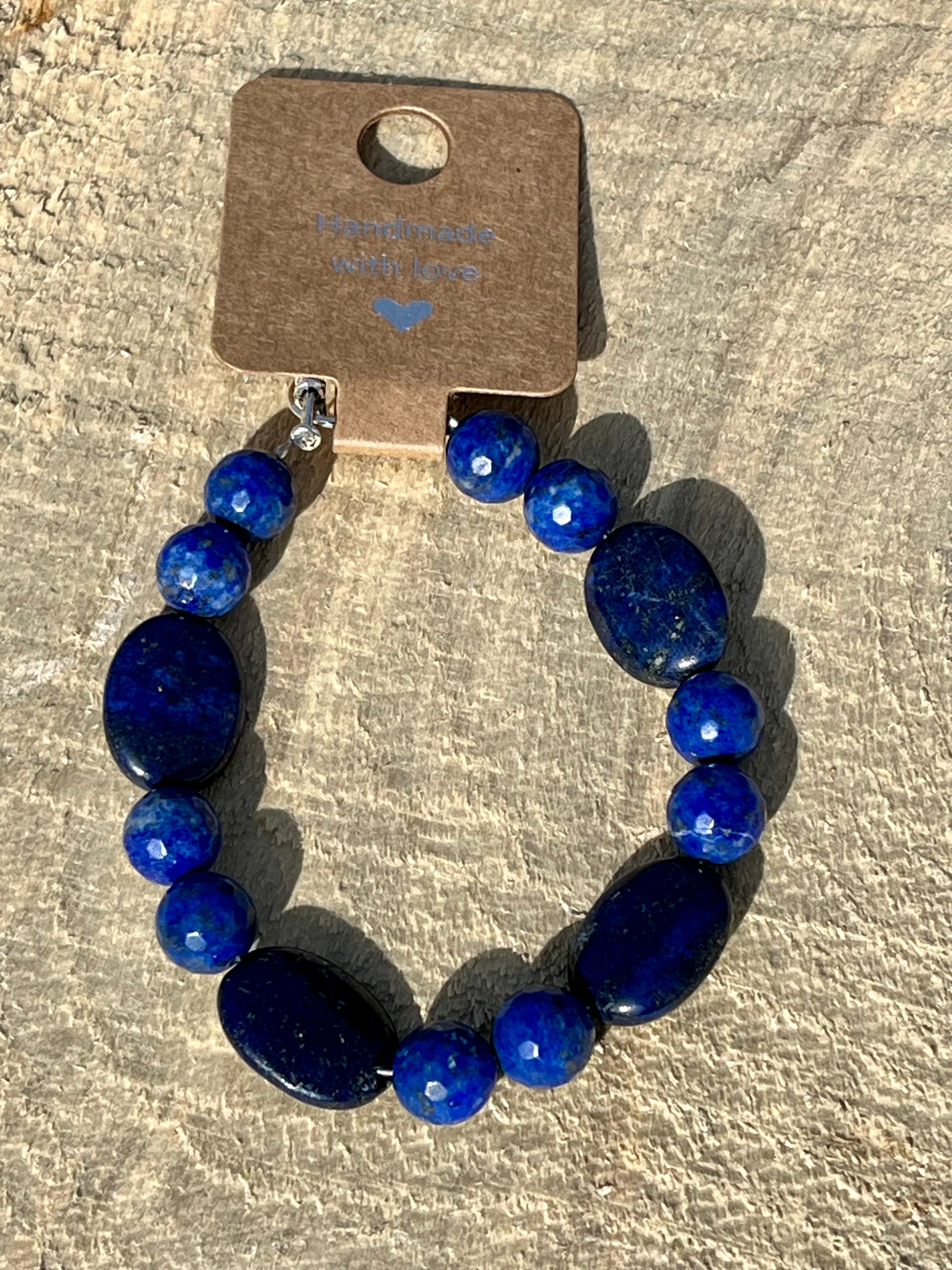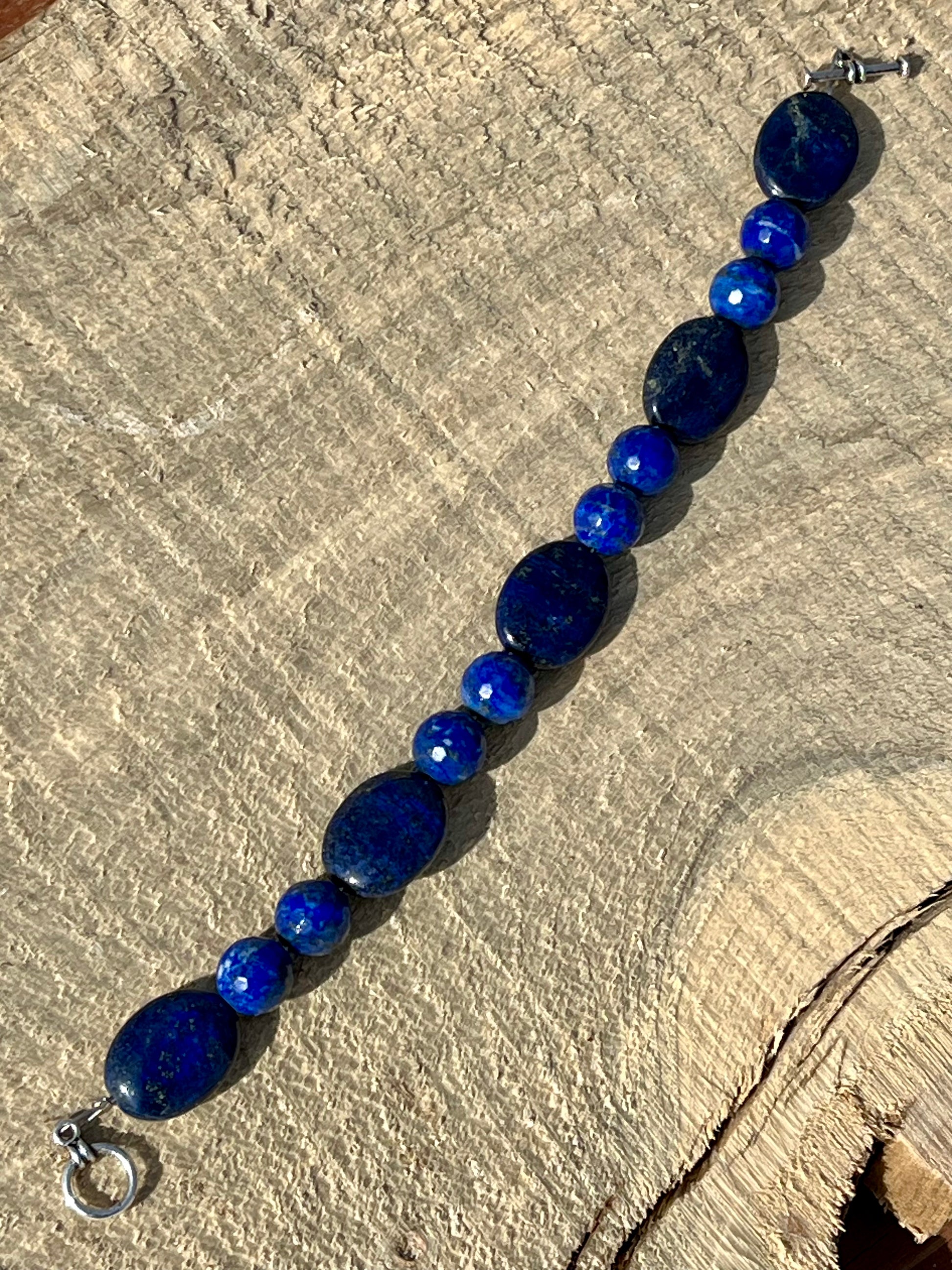 Interspersed among the lapis ovals are faceted lapis stones, strategically placed to catch and reflect light, adding a sparkling dimension to the bracelet. The facets on these stones enhance the natural luster of the lapis lazuli, creating a play of light that showcases the gemstone's inherent beauty.