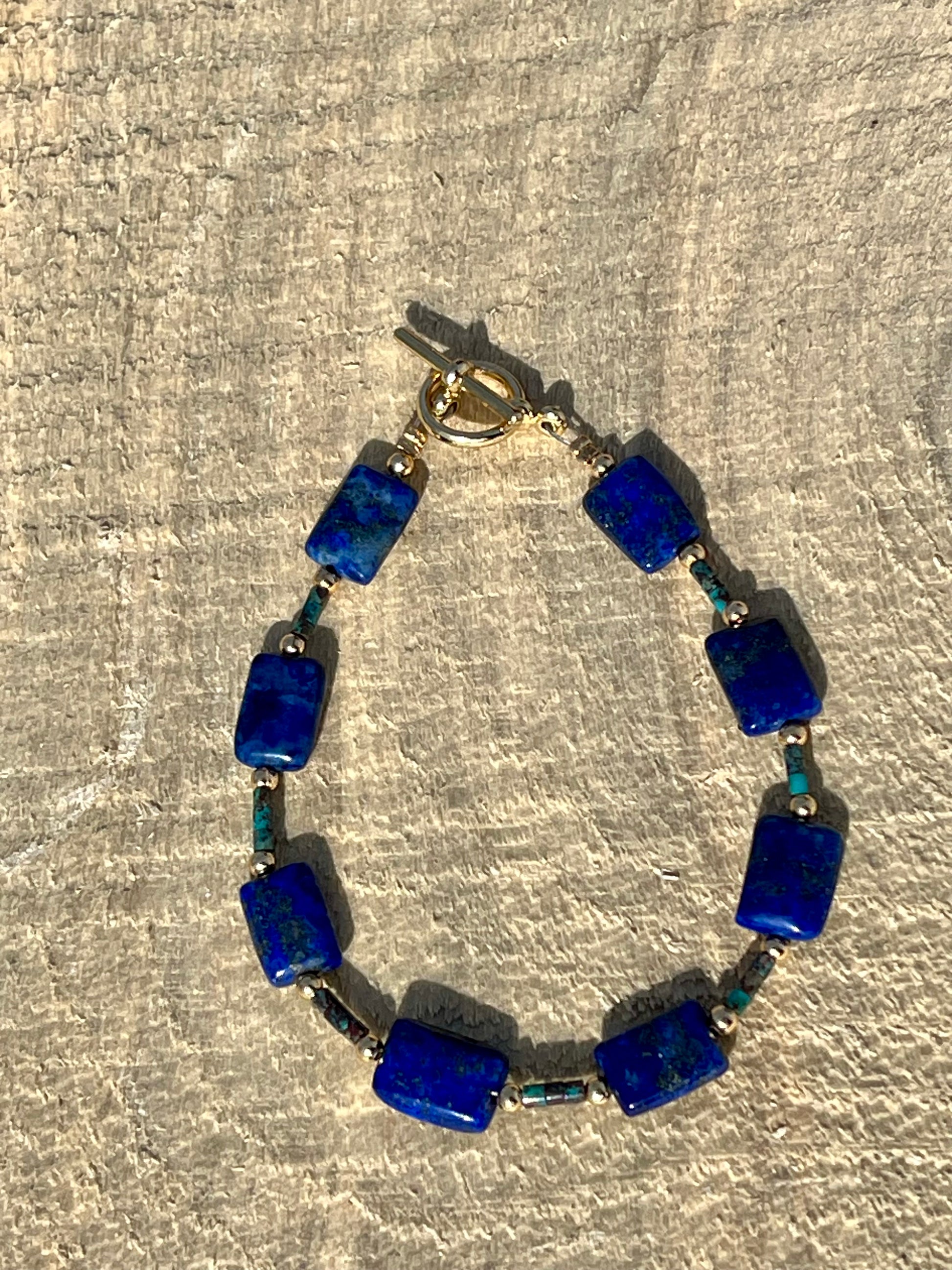 The bracelet showcases an array of lapis tiles, each meticulously polished to reveal the stone's inherent elegance. The deep blues and intricate patterns of the lapis create a sense of depth and mystery, reminiscent of the ocean depths. Interspersed among the lapis tiles are segments of bamboo coral, adding a touch of warmth and unique texture to the design.