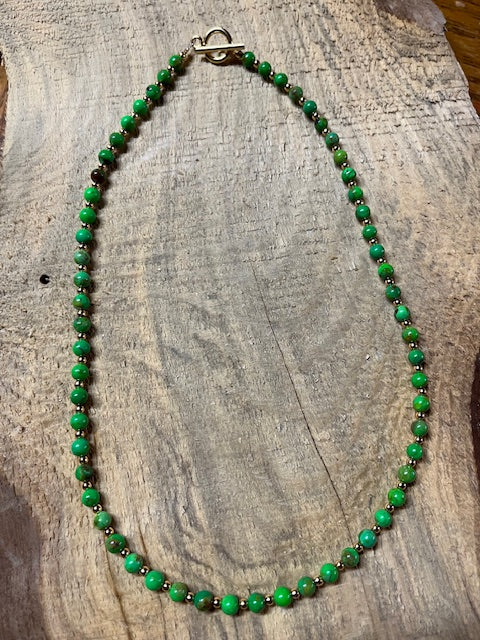 Introducing our captivating Lime Green Turquoise Small Rounds Necklace, elevated with exquisite spacers to accentuate the natural brilliance of each stone. This necklace exudes elegance and sophistication, featuring delicate round turquoise beads adorned with shimmering spacers that enhance their luminous charm.