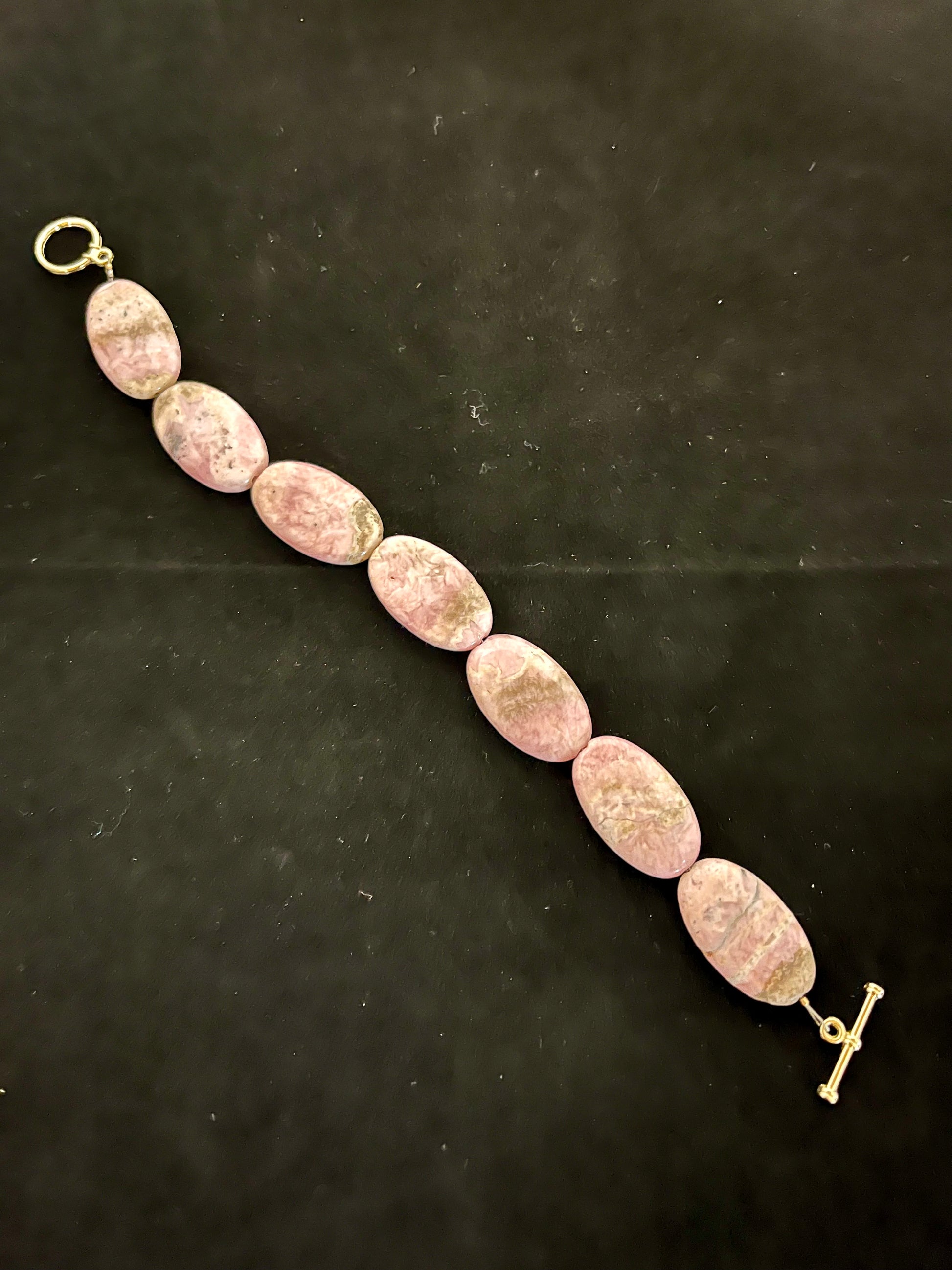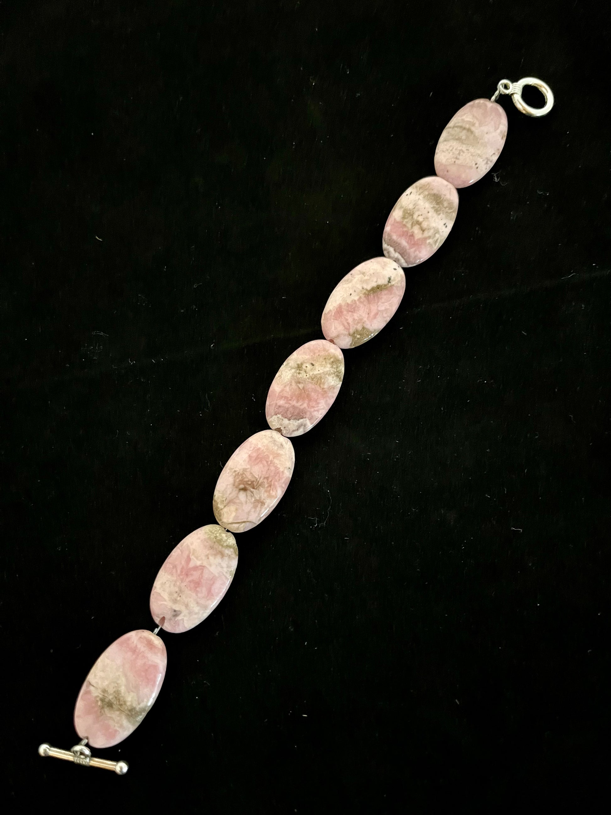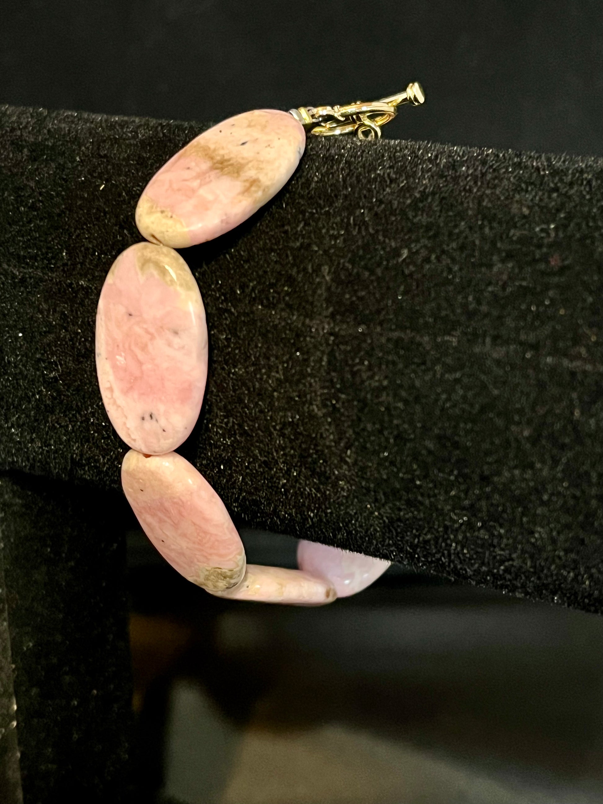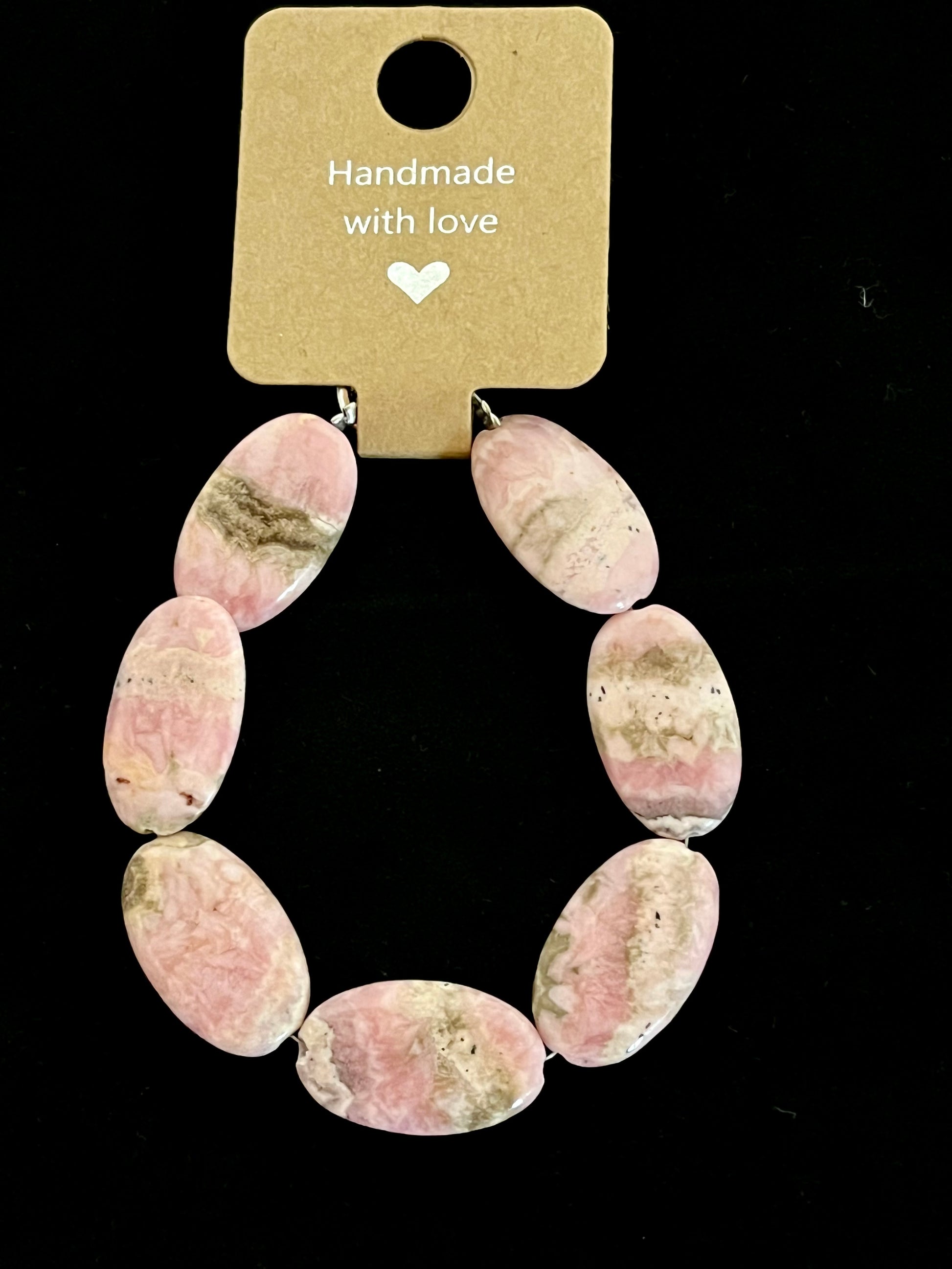 Introducing a bracelet adorned with the delicate beauty of peach blossom jade ovals, reminiscent of a stunning pink camo pattern. This unique piece is a celebration of nature's elegance, showcasing the soft and enchanting hues of peach blossom jade in a distinctive and captivating design.